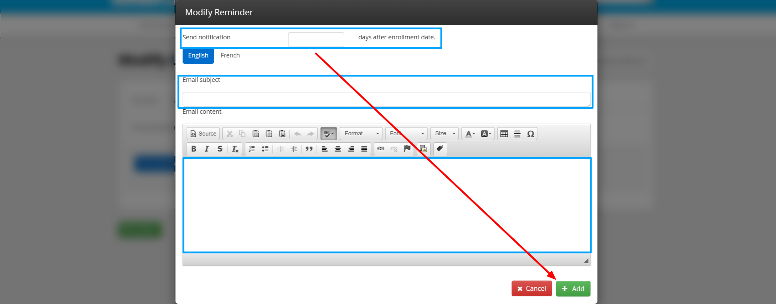 7. When you are satisfied, click ‘Add‘. Repeat steps 5-7 for as many reminders as you would like to create.