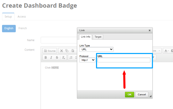 4. You will arrive at the ‘Create Dashboard Badge’ interface. Enter a title for it, and enter the text you would like to turn into a hyperlink in the rich text editor.