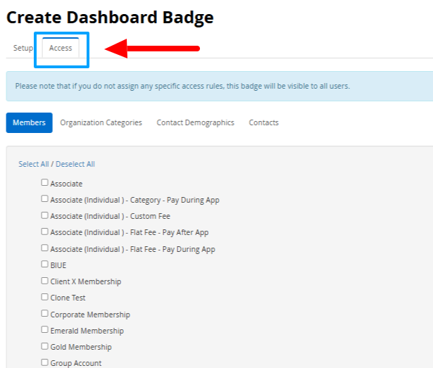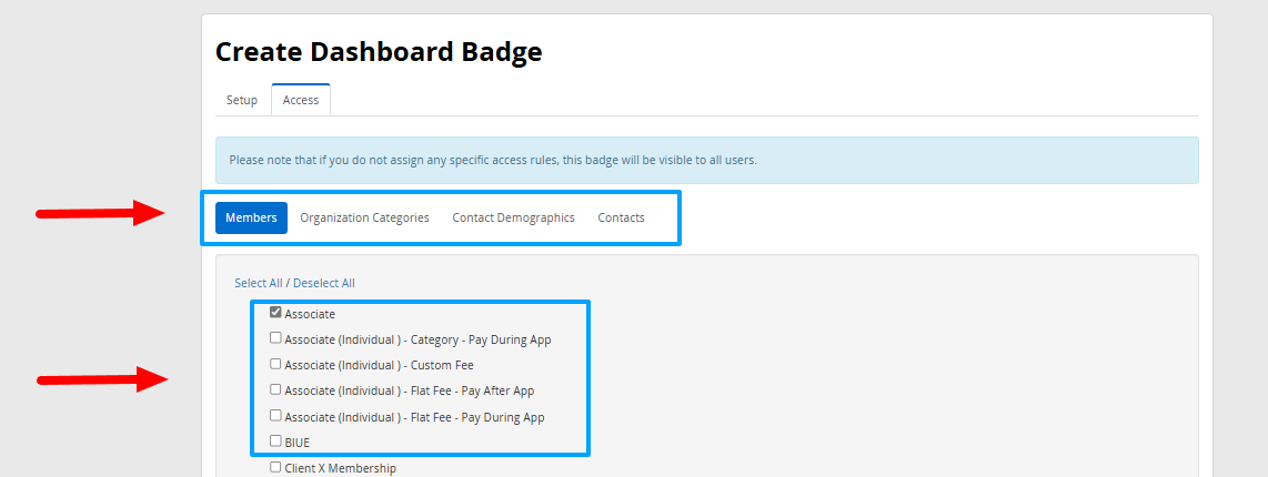 9. You will arrive at a page where you can configure which membership categories, demographics or specific contacts can see this badge. Use the buttons to navigate between these categories, and click the checkboxes to enable visibility for a given group. Selecting no specific groups or contacts will allow all users to see the badge.