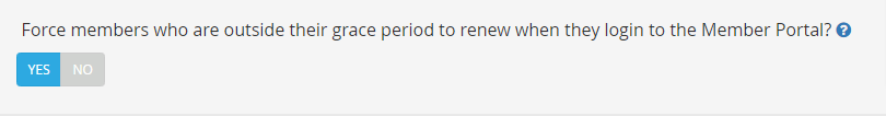 If the ‘Force Renewal on login?’ toggle is OFF, then Portal Login access will be removed for Lapsed Memberships outside the Grace Period.