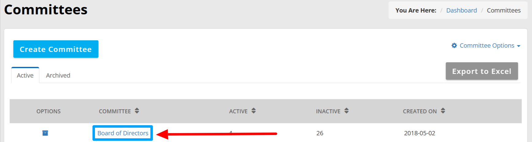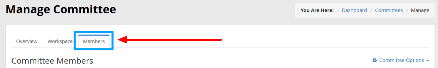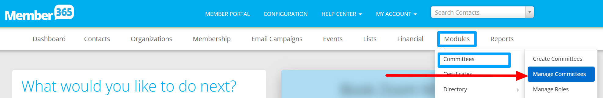 2. On the navigation bar, hover over ‘Modules', then hover over 'Committees' in the dropdown and click 'Manage Committees' in the subsequent dropdown.