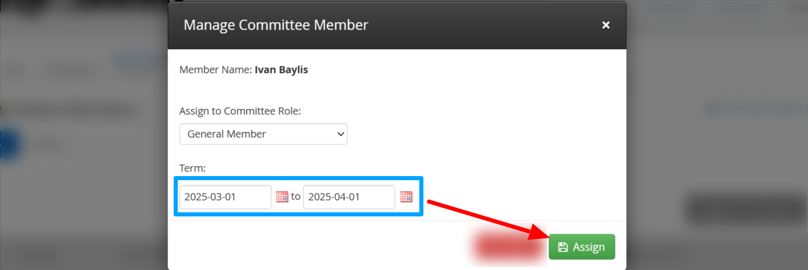 6. In the new window, use the date pickers to choose this member’s new term, and then click ‘Assign‘.