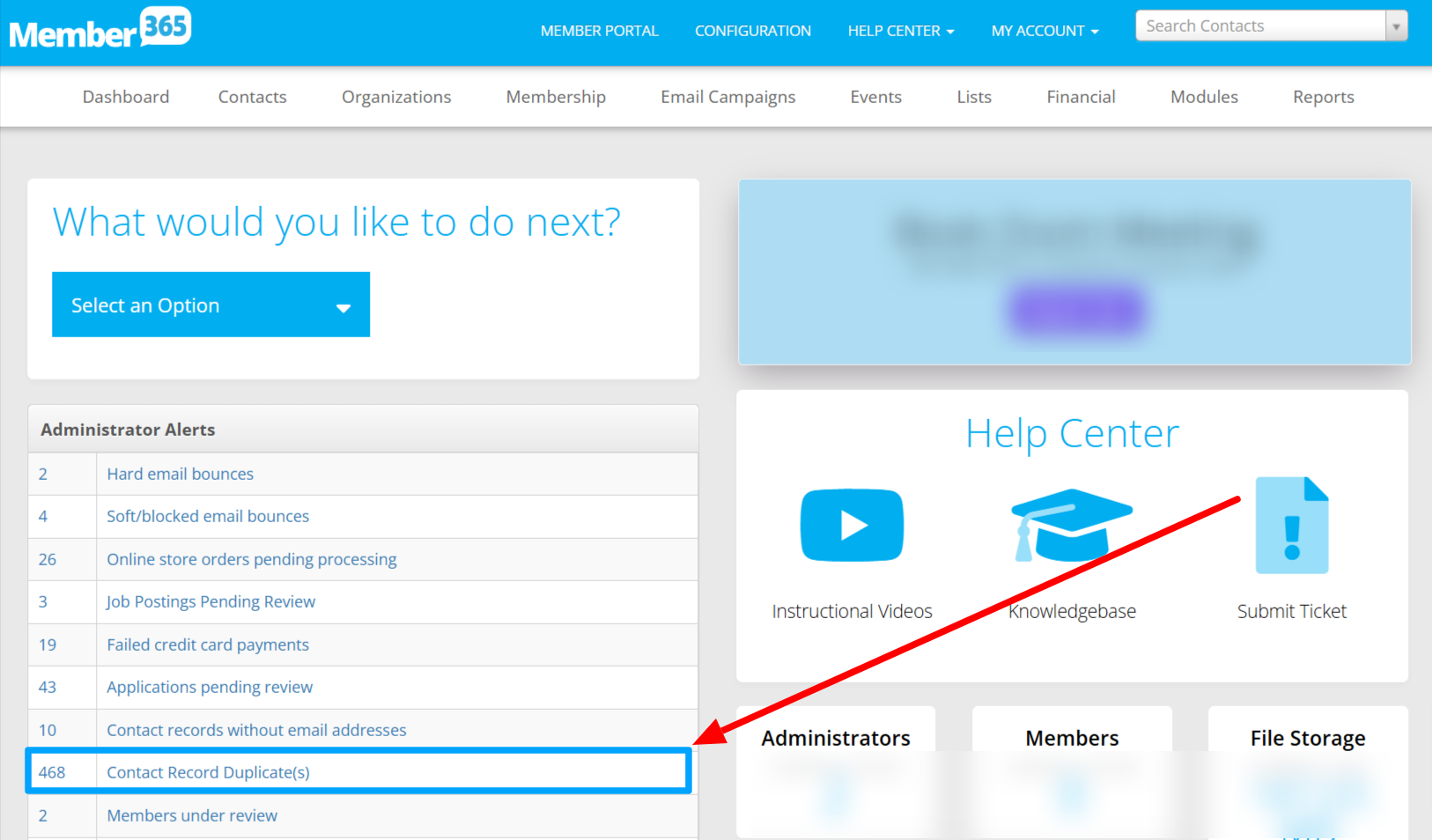 1. If you have duplicate contact records, you’ll notice an alert mentioning it from your administrator dashboard. Click it.