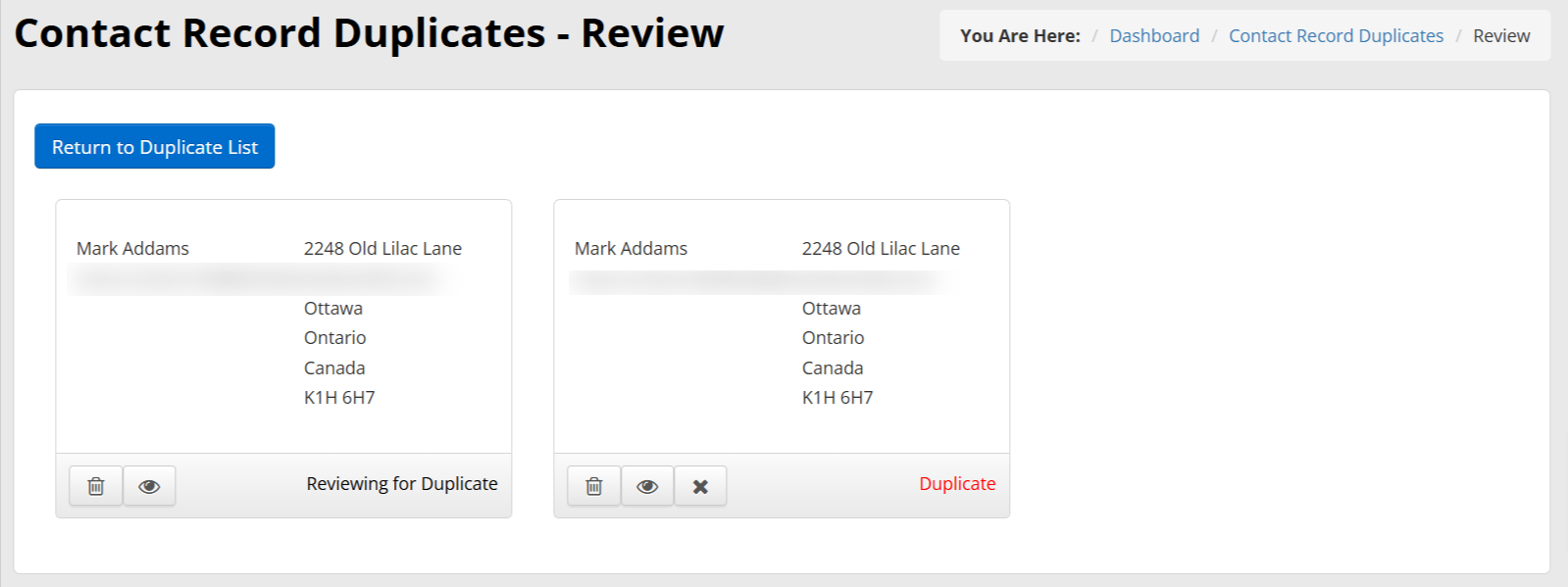 This will allow you to confirm duplication, and decide which contact records you would like to keep or delete.
