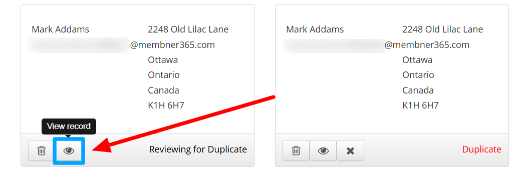 3. This screen will present every record that Member365 believes to be a duplicate for a single contact. Use the tools detailed below to manage your duplicate records: