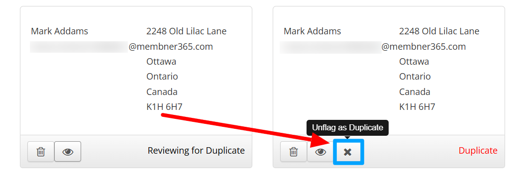 In the event that Member365 mistakenly flags a contact record as a duplicate, click the ‘Unflag as Duplicate’ button to tell Member365 to stop notifying you about the contact record.