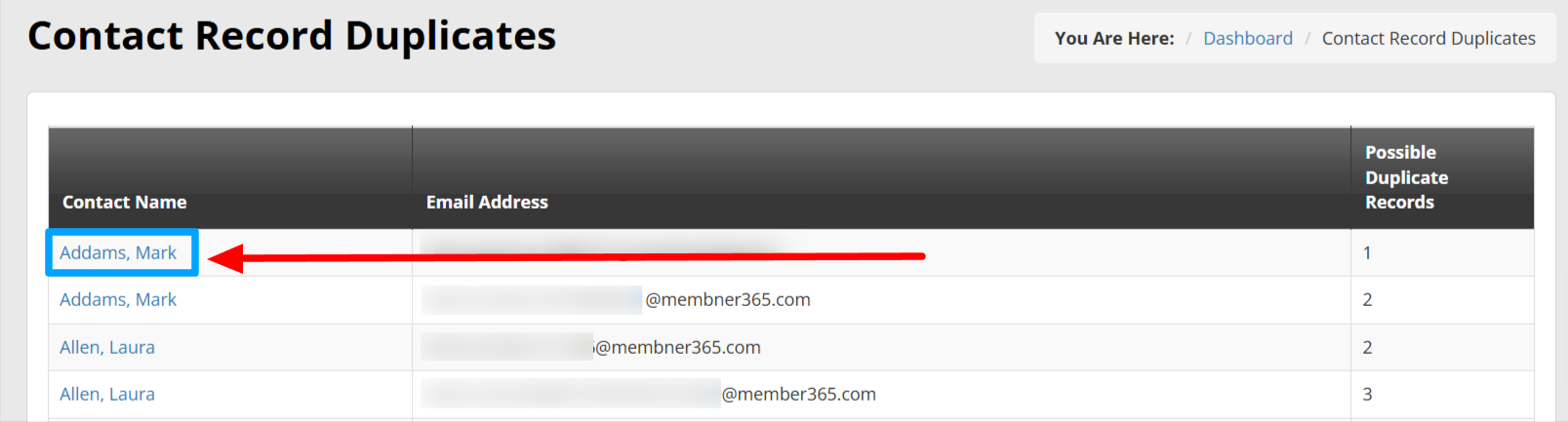 2. The next screen will present a list of contacts that Member365 believes have found duplicate records of. Click one that you would like to investigate.