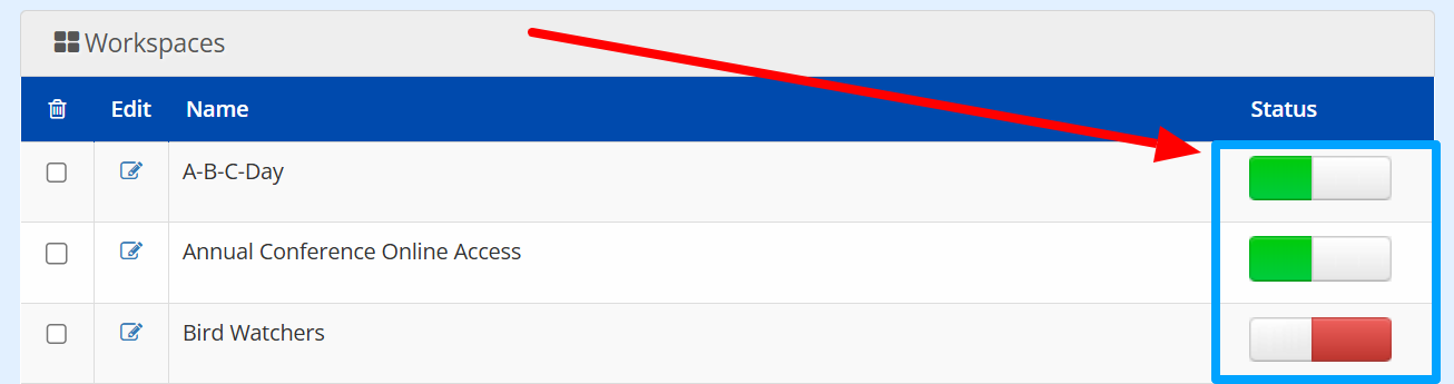 4. The toggle switch next to the name of each workspace allows you to show or hide it. If it is set to the left, green position, it will be visible; switch it to the red position to hide it.