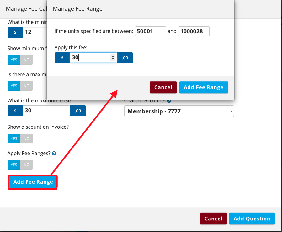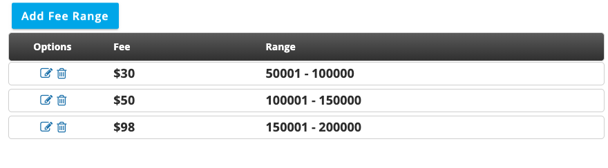 Toggle on ‘Apply Fee Ranges?’ and click the ‘+ Add Range’ button to create as many ranges as necessary.