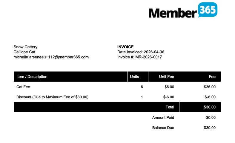 In the example above, a prospective member would have an invoice that shows the base membership fee on one line, and a line beneath labeled “Cat Fee”.