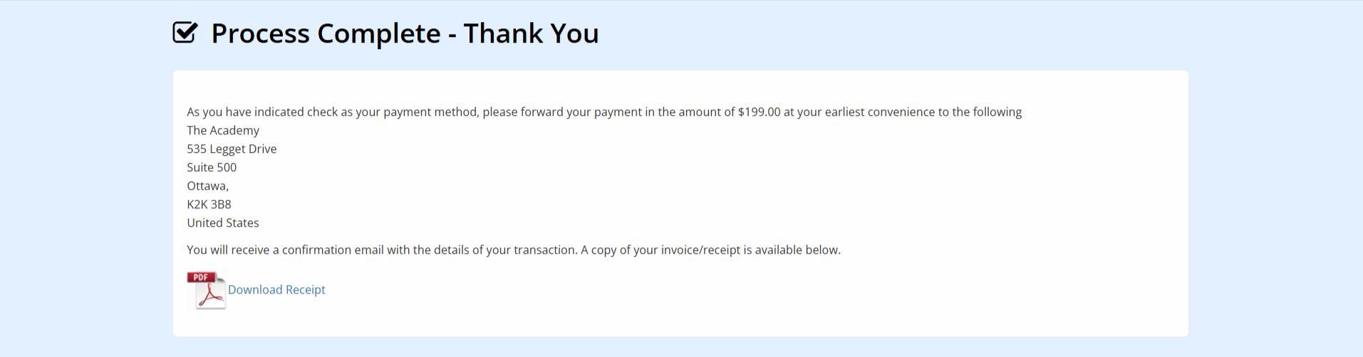 Situation 2 (Cash or Check): if you select one of these two options and then ‘Process Payment‘, you will be presented with the following message: