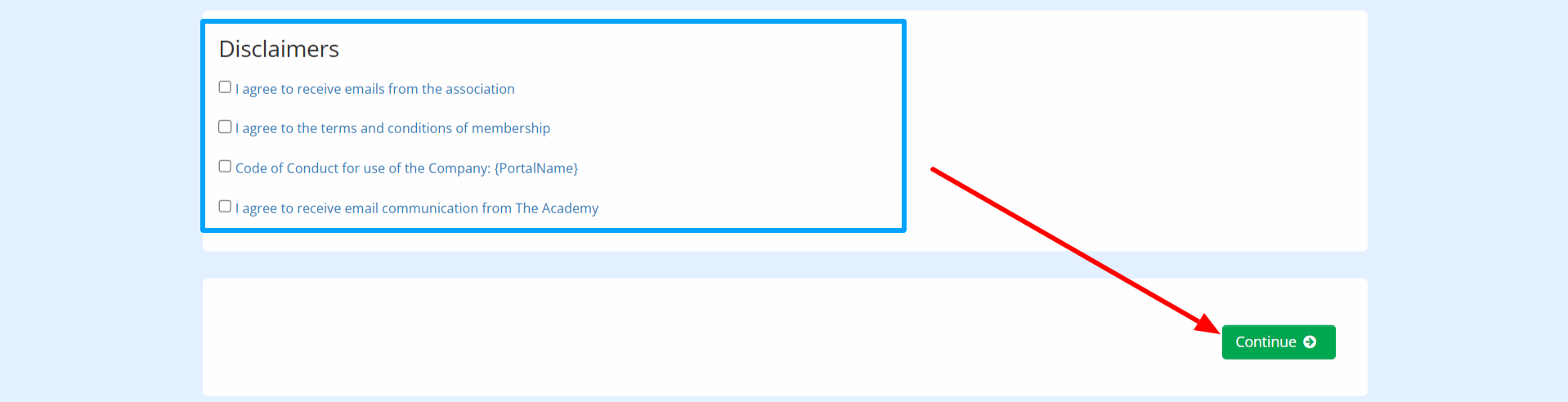 7. Ensure the disclaimers are agreed to (checked off) and click ‘Continue‘.