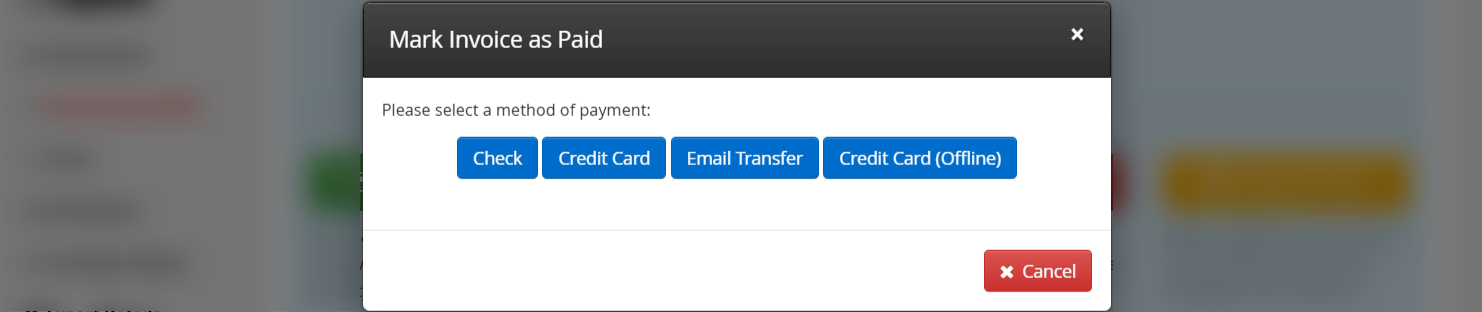 If you elected to pay by cash or check, click ‘Mark as Paid‘ to bring up a new window, ‘Mark Invoice as Paid’; click the payment type that corresponds to the payment type.