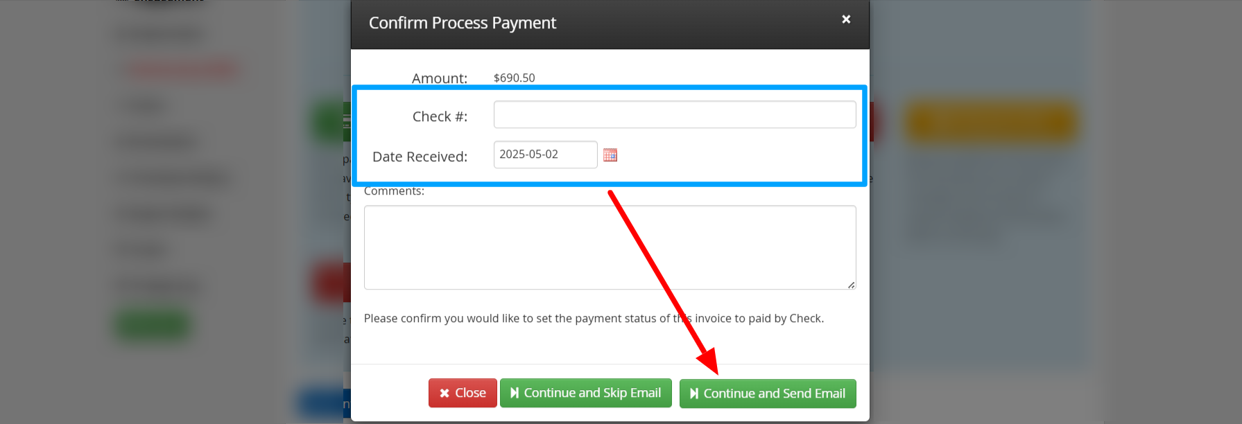 Check: Fill in the check number, the date received, and any necessary comments, then click ‘Continue and Send Email‘.