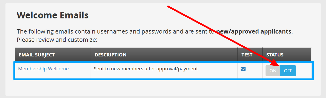 5. Look for the ‘Membership Welcome’ email, as this is the email that welcomes contacts to the member portal, and set the Status to 'OFF'