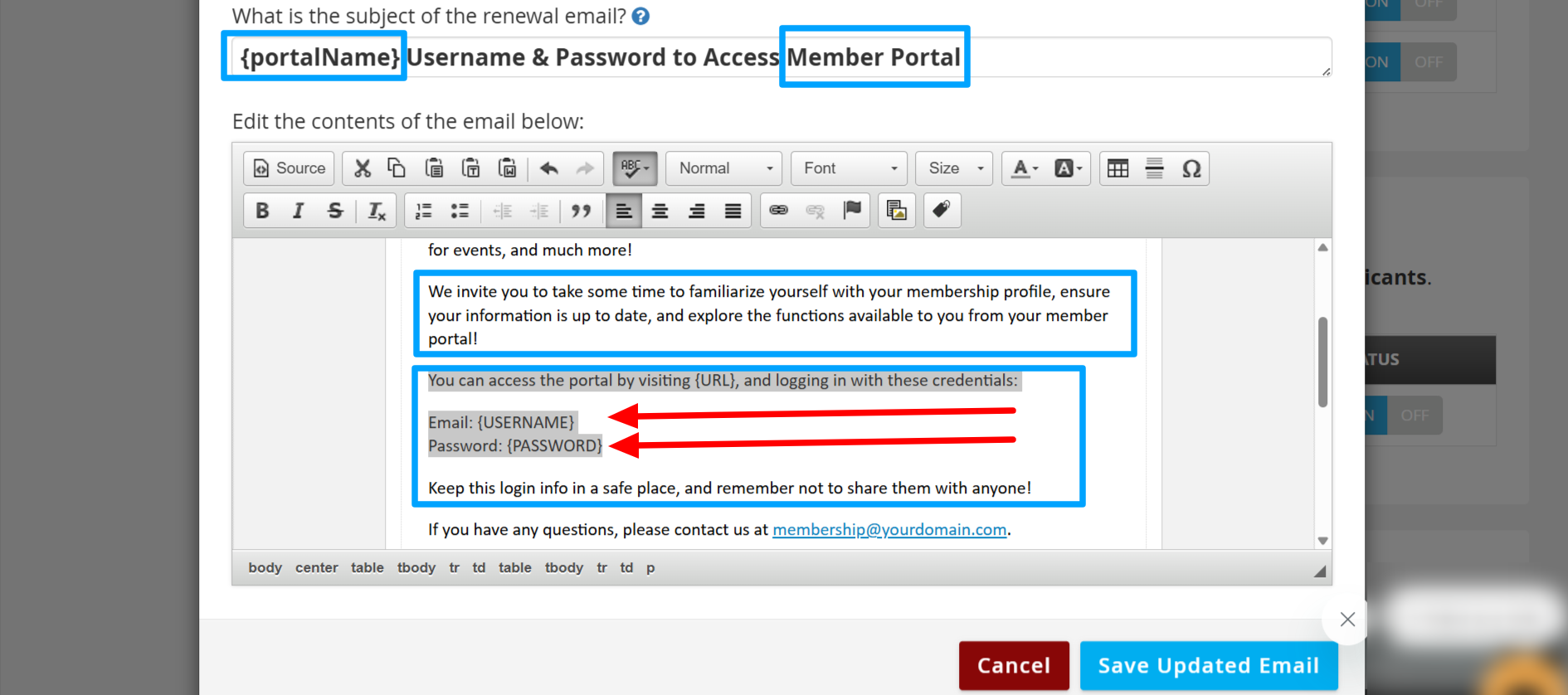 6. Alternatively, you can still send out a welcome email (leave Status set to ON), but you will need to edit the contents of the email to remove any reference to the Member Portal, Usernames, and Passwords.