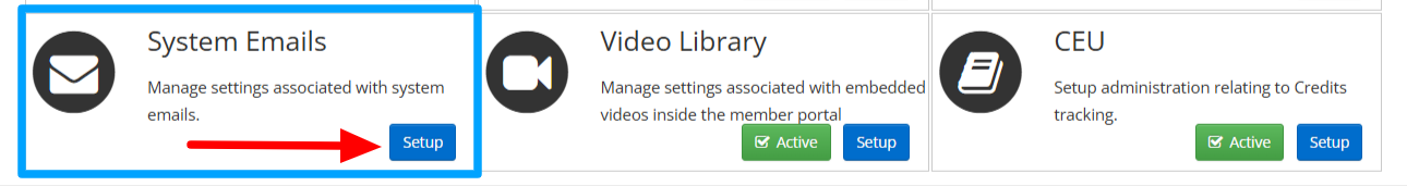 9. Scroll through the list of configuration options, and click ‘Setup’ in the ‘System Emails’ box.