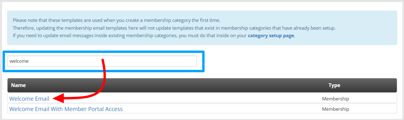 The email template that grants portal access is called the ‘Welcome Email‘. Steps to access your Membership Category’s Welcome Email will follow.