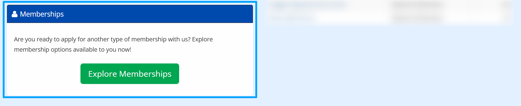 On the Member Portal, there is a button labeled ‘Explore Memberships’. When a Member clicks ‘Explore Memberships’, they will see a list of your Membership Categories and the corresponding application links.