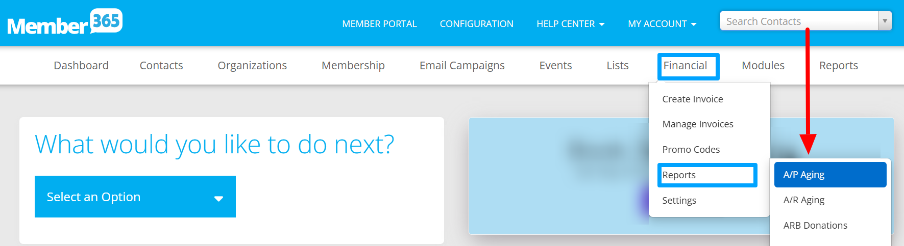 2. In the top bar, hover over ‘Financial‘; then, hover over 'Reports' in the dropdown menu and select ‘A/P Aging‘ from the subsequent dropdown