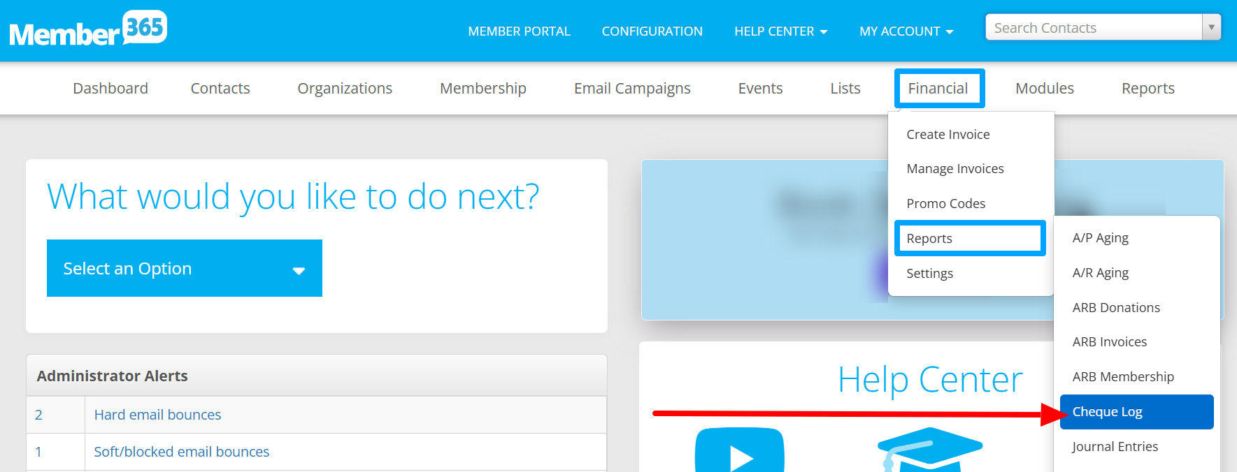 2. On the top bar, hover over ‘Financial‘ > 'Reports' and click 'Cheque Log'