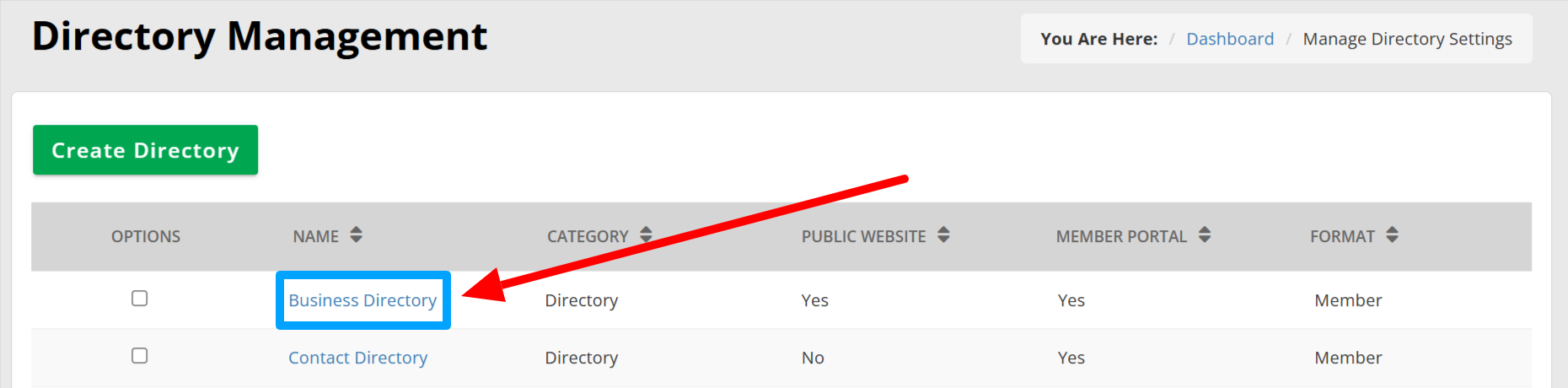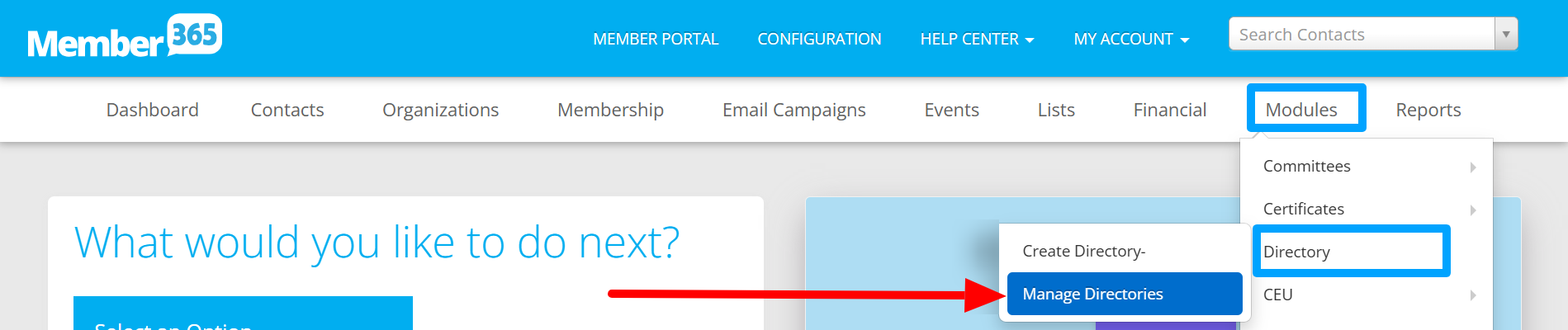 1. Login to your Member365 Administrator Dashboard, hover over 'Modules' and, in the dropdown, hover over 'Directory.' Then, click 'Manage Directories' in the subsequent dropdown menu.