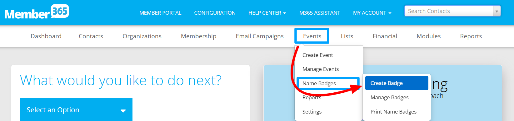 From the Admin Portal Dashboard, hover over 'Events'. Then, in the drop-down menu, hover over 'Name Badges', and select 'Create Badge'