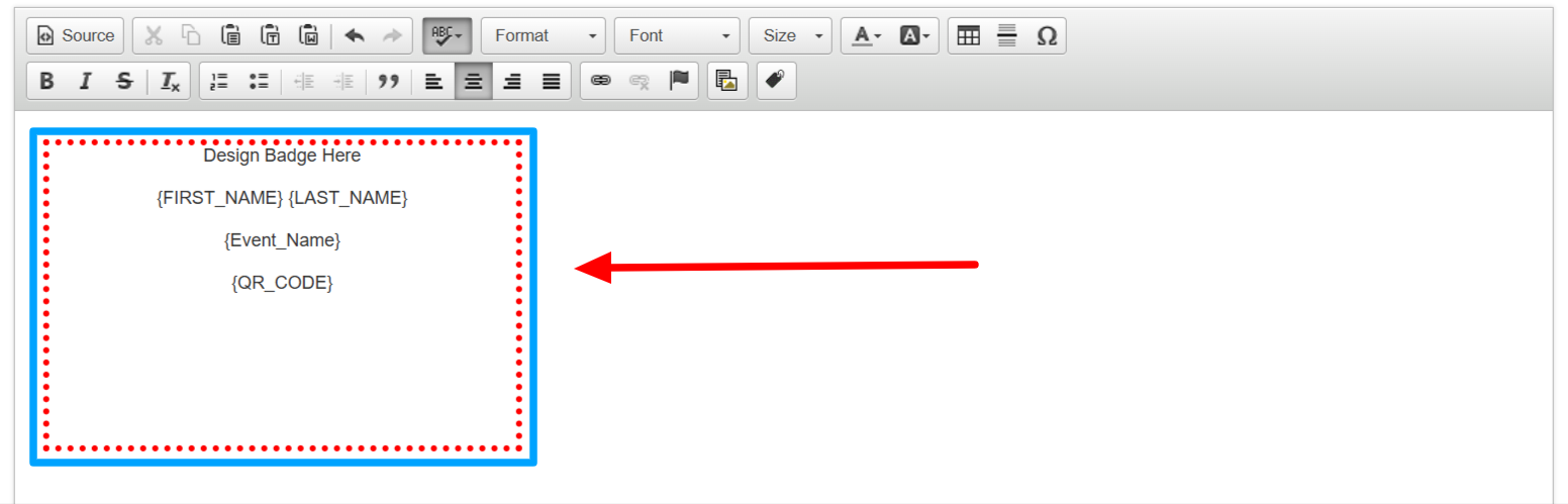 Then, design your badge within the red-dashed border. Be sure to use the relevant merge tags to auto-populate the name badges with registrant information.