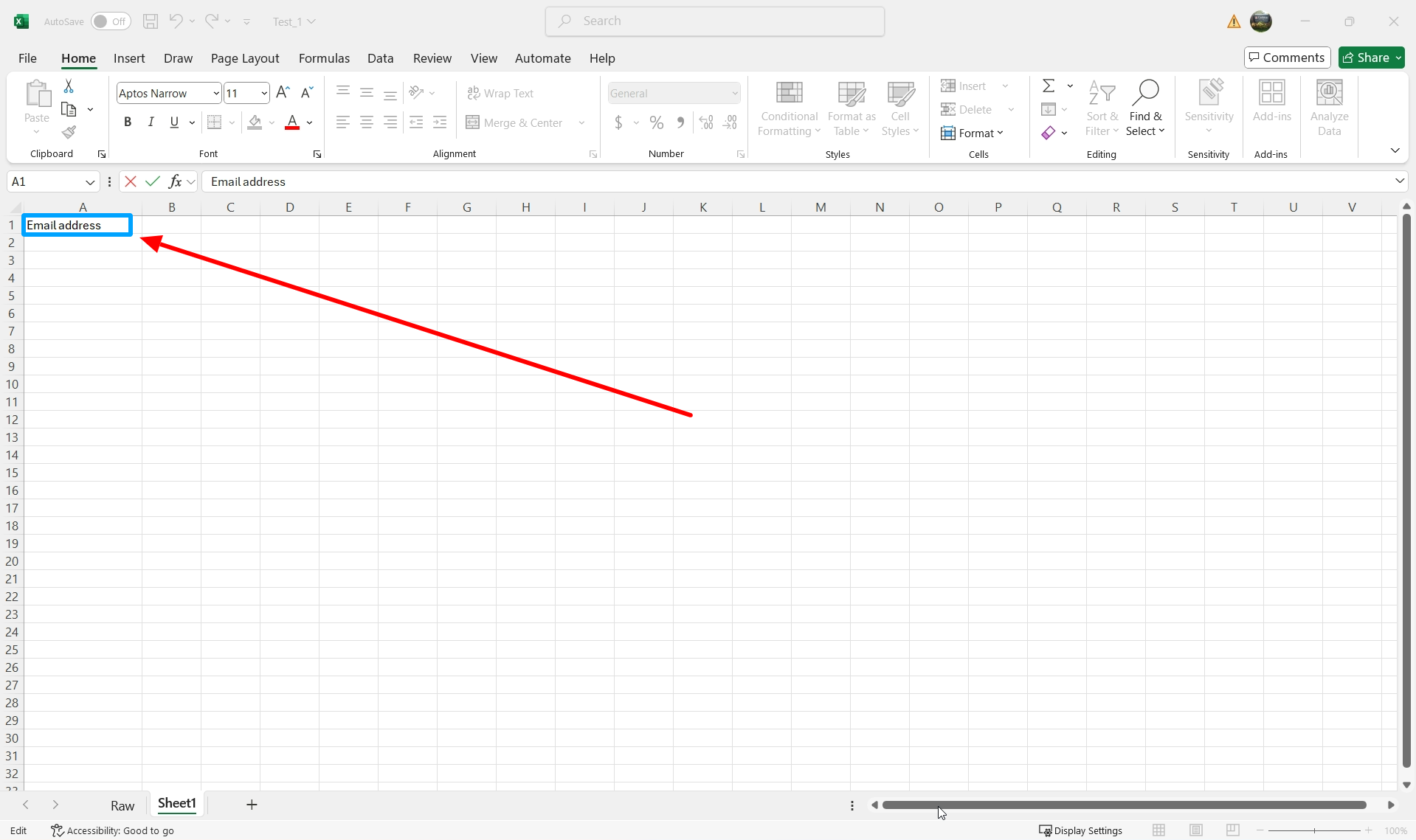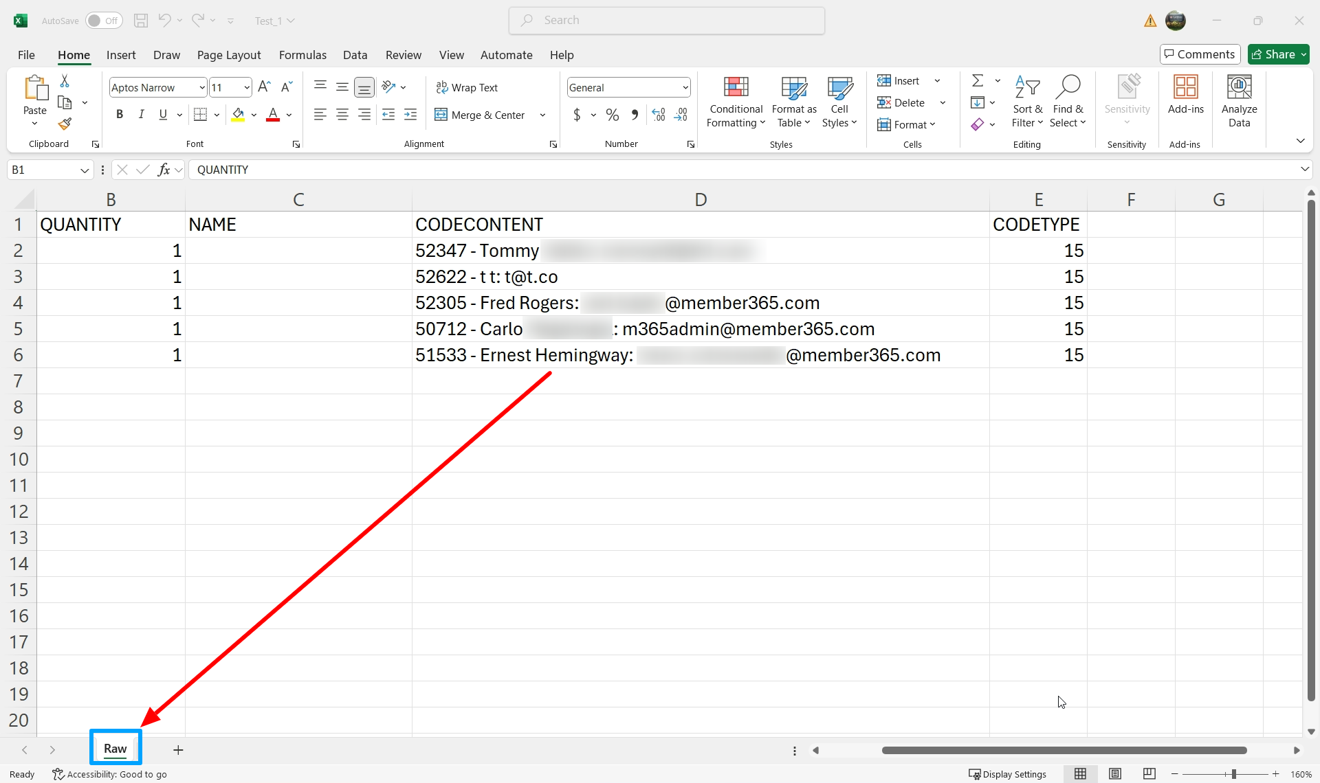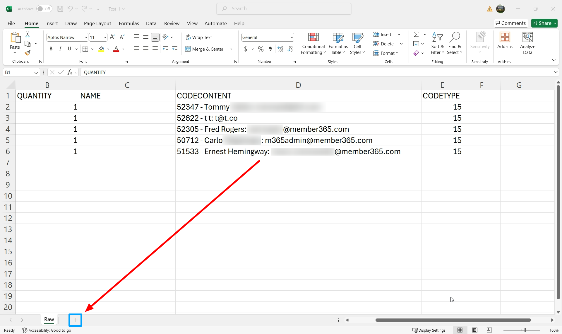 In Excel, rename the sheet "Raw" by double-clicking the name of the tab and typing the new name in (you can use whatever name you want; you will just need to substitute "Raw" for that name in the formula in Step 12, below).