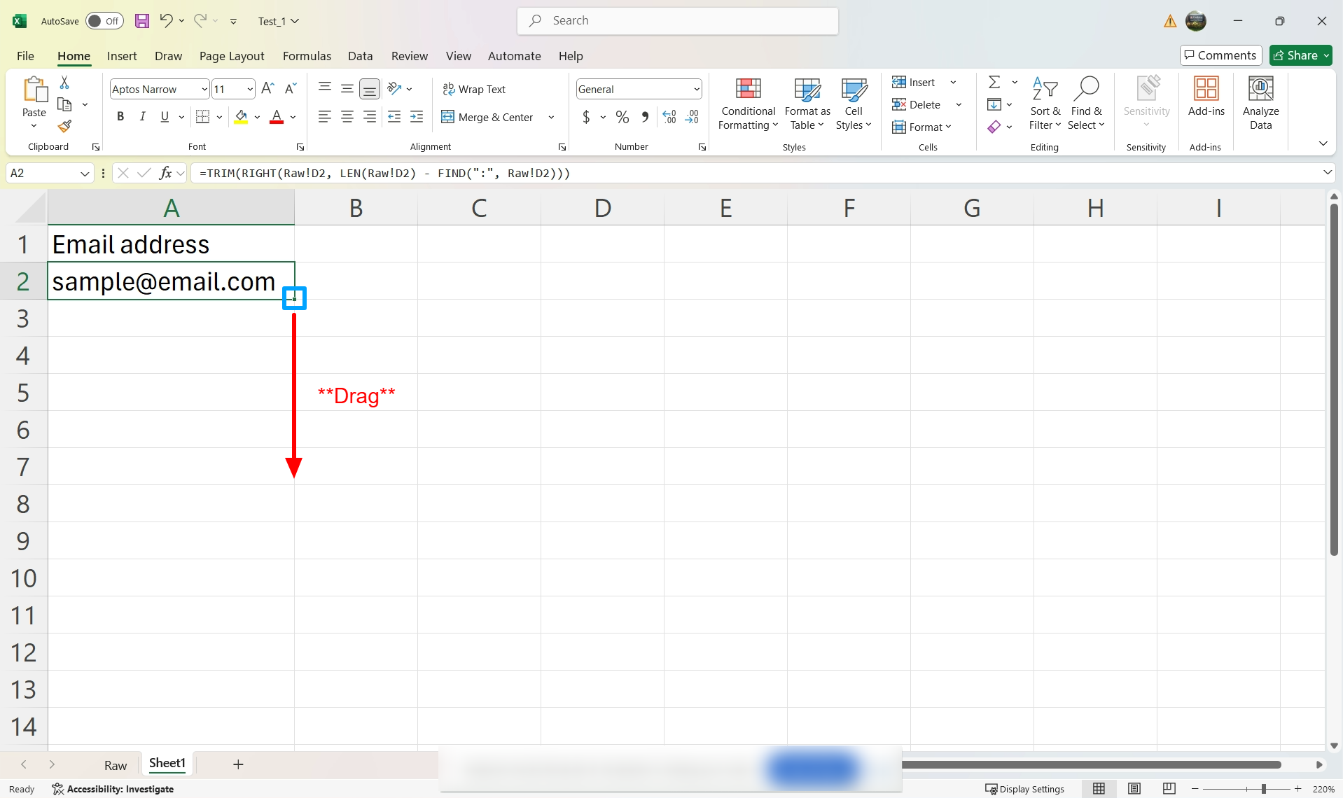 In A2, write (or copy/paste): =TRIM(RIGHT(Raw!D2, LEN(Raw!D2) - FIND(":", Raw!D2)))