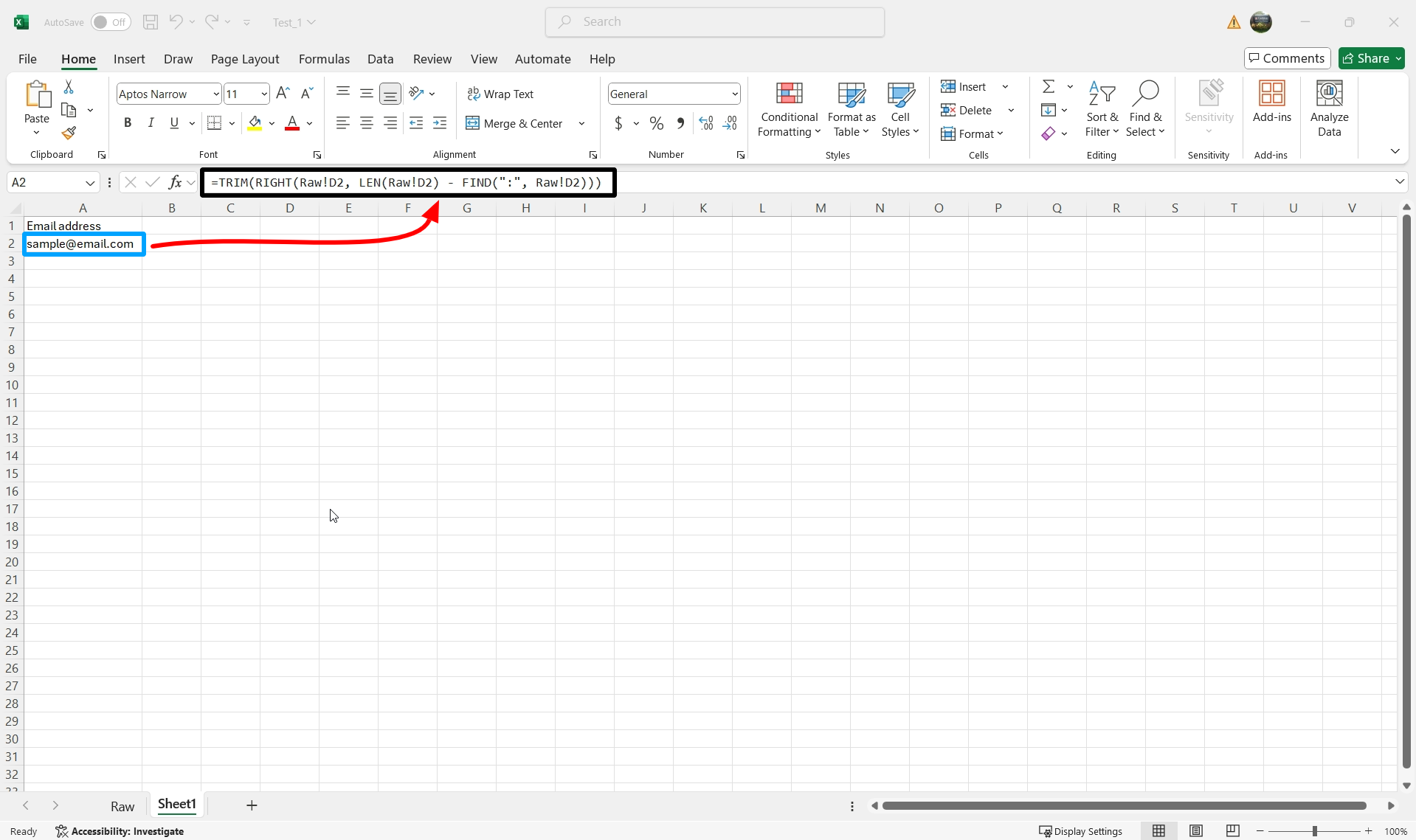 As soon as you paste it, the email from A2 in "Raw" will be displayed, but you'll be able to see the formula in the 'formula' (black) box.