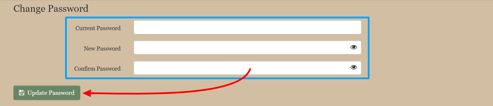 Enter your current password. Then Enter your new password and confirm it. And, click 'Update Password'