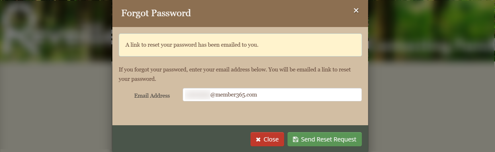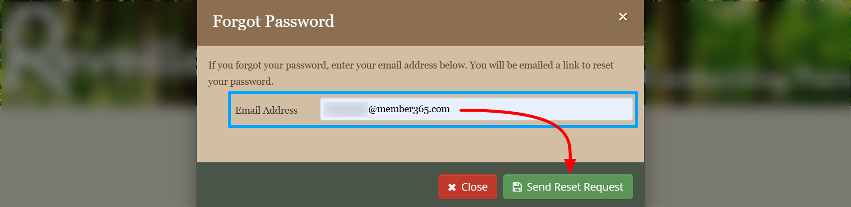 In the window that pops up, enter your email and click the 'Send Reset Request' link
