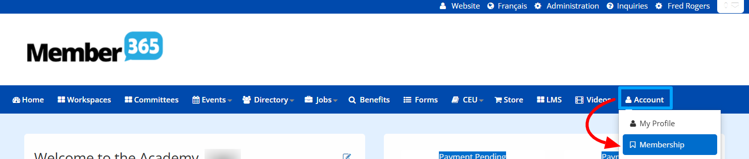 From the Member Portal homepage, click 'My Account', then 'Membership'