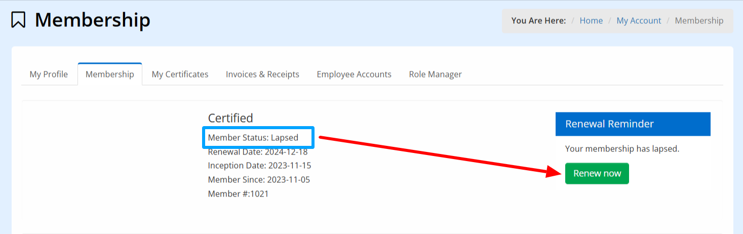 If your membership is lapsed, a renewal reminder and 'Renew Now' button will be displayed. To renew, simply click the 'Renew Now' button
