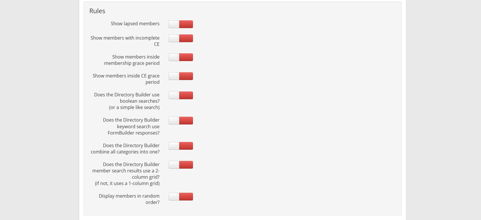 - Use the 'Rules' tab to your advantage: This tab allows you to include or exclude members with various membership standing or CE credit completion. Using this tab, we recommend you also set up your directory so it randomly sorts the directory each time it's initially loaded (before search criteria is applied) to give everyone in the directory the chance to be displayed at the top, rather than always sorting them alphabetically - as is the default setting.