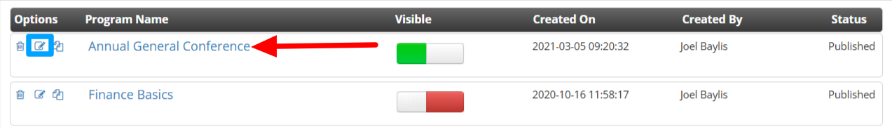 3. Click on the name of the course you would like to feature, or on the pencil icon next to its name.