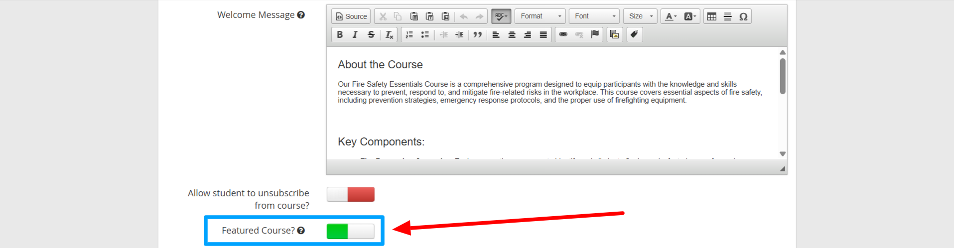 4. On the first tab, look below the text editors for a toggle switch labelled ‘Featured Course’; click the left part of the button to turn it green and enable it.