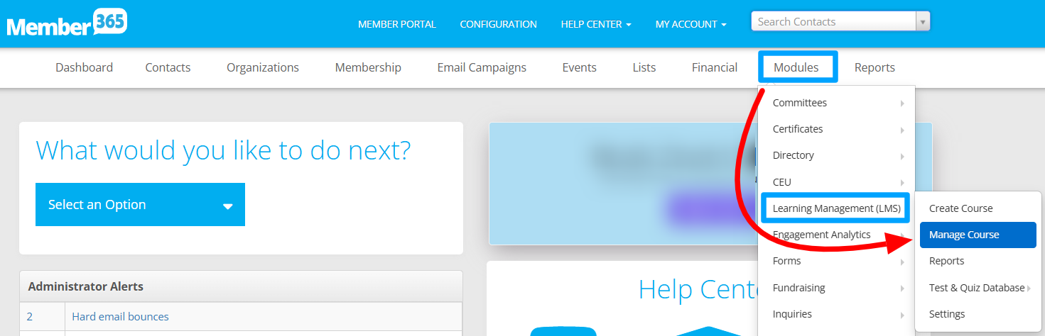 2. On the top bar, hover over ‘Modules‘, then hover over ‘Learning Management (LMS)‘ and then click ‘Manage Course'