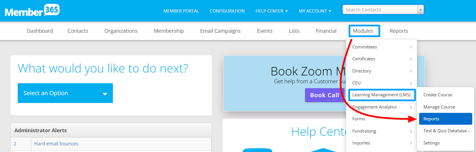 2. Hover over 'Modules', then over ‘Learning Management (LMS)‘ and click ‘Reports.‘
