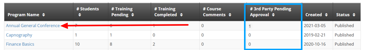 3. Search the indicated column to find courses where third-party completion is pending approval; in this case, the only one with a pending submission has a ‘1’ in this column. Click the name of the corresponding program.