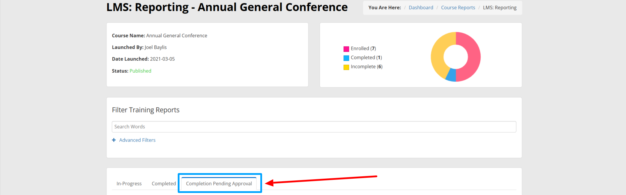 4. At the bottom of this page, click the ‘Completion Pending Approval‘ tab.