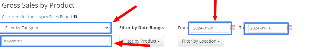 4. Use the date pickers to narrow down what period you would like to view reports for; use the keyword search or category list to narrow down what products you would like to see reported.