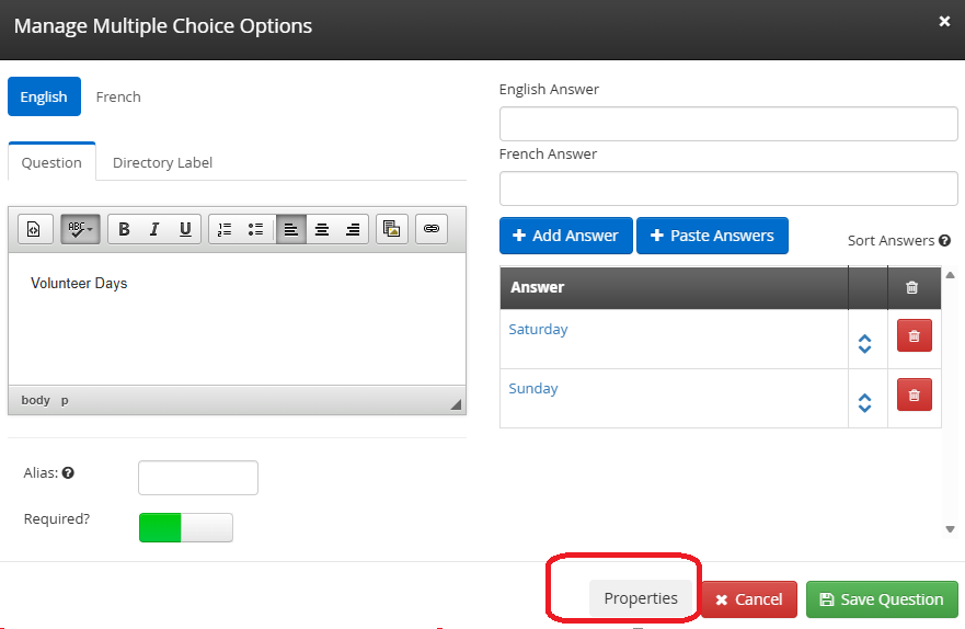 If a Form Question has a ‘Properties’ button, there is a set of check-boxes it will almost always have regardless of Form Type, unless you are creating a Voting Form.