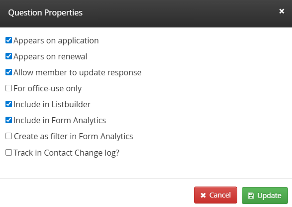 Depending on the type of Form you are creating, you will be presented with a set of check-boxes upon opening the Question’s Properties. This sub-header will expand on the purpose of each check-box.