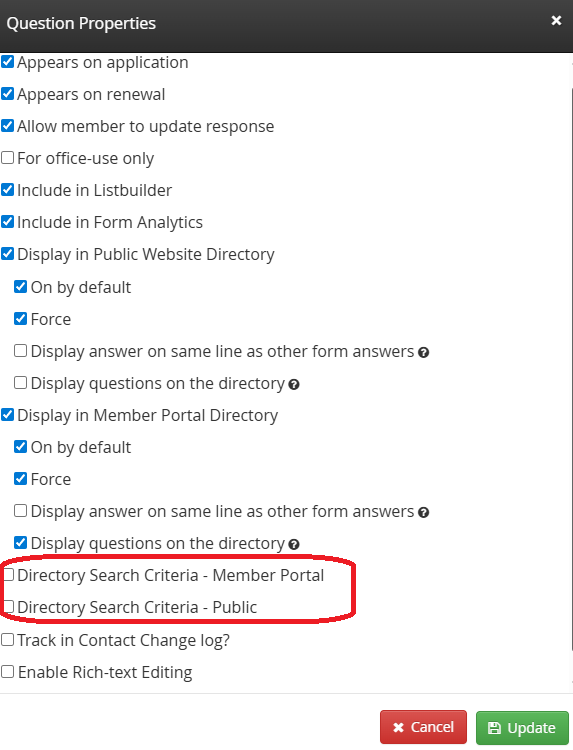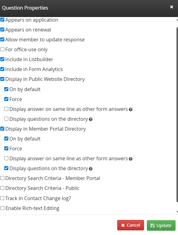 On by default – When a Contact is added to the directory, their response to the question will display initially. If ‘Force’ is not checked off, they can later choose to hide that response if they wish.