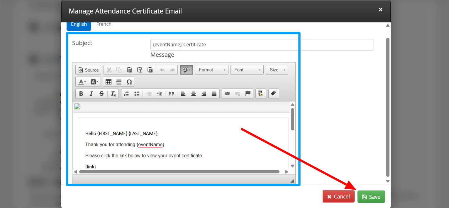 You can then edit the email accordingly in the window that pops up. Click 'Save' to save your changes to this email.